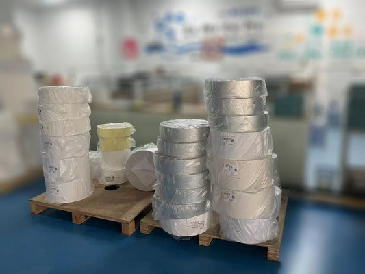 কার্যকর লেবেলিংঃফাঁকা জলরোধী BOPP আঠালো জাম্বো রোল লেবেল 75μ মুখের বেধ এবং তেল আঠালো সঙ্গে